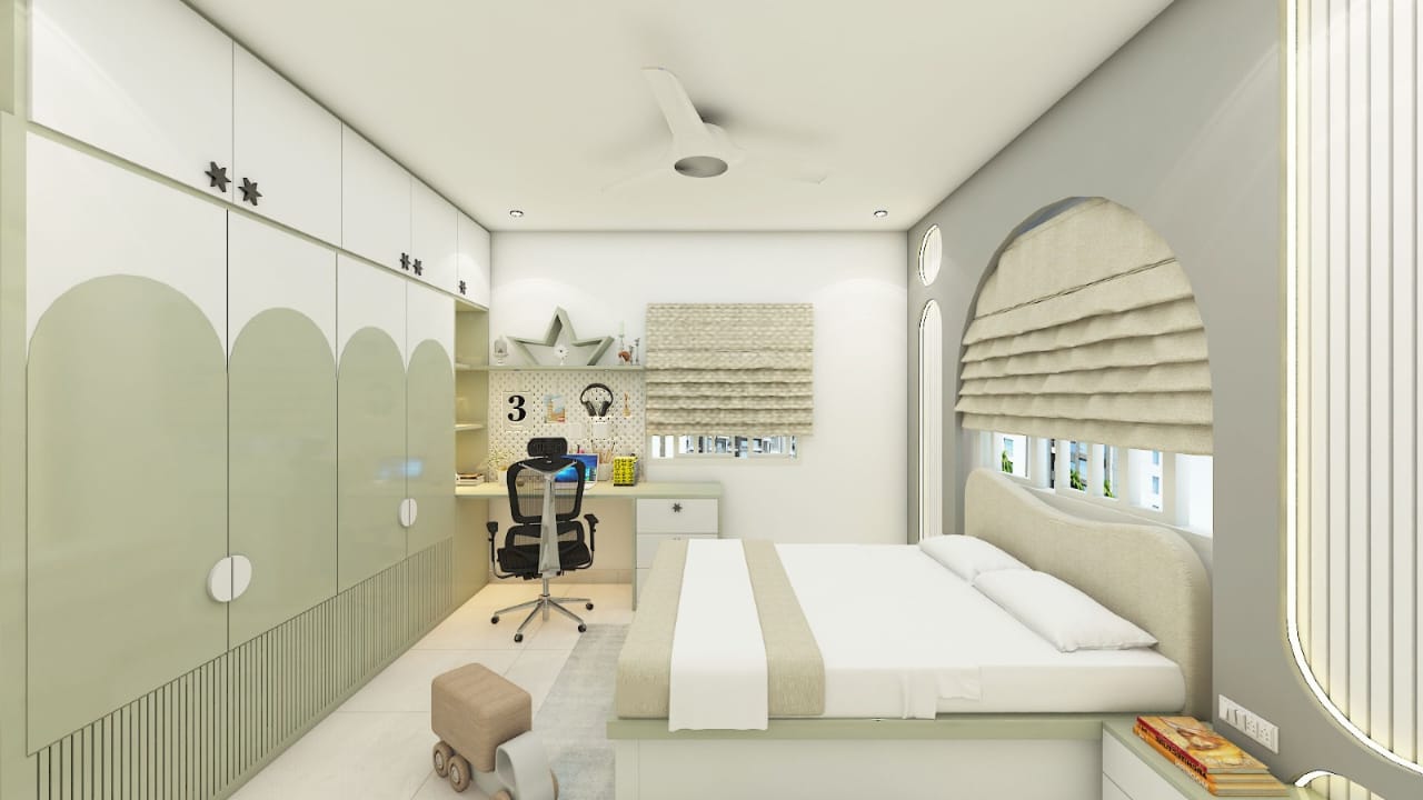 Modern and soothing bedroom interiors designed for comfort, elegance, and perfect space utilization.